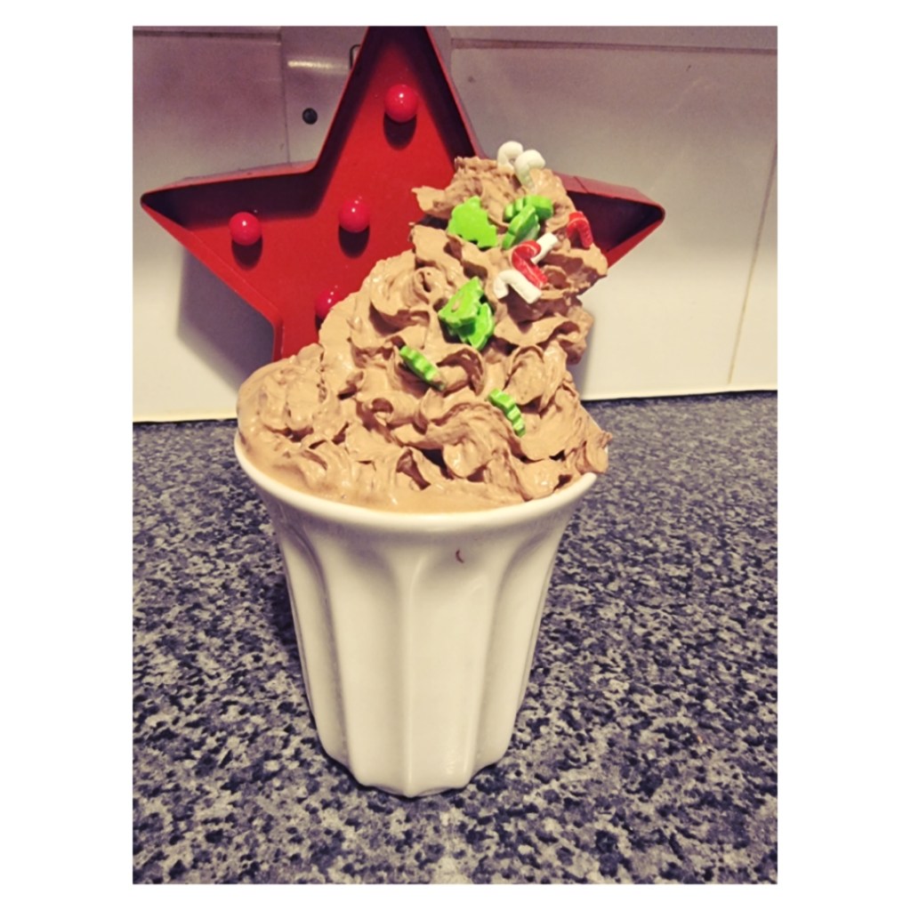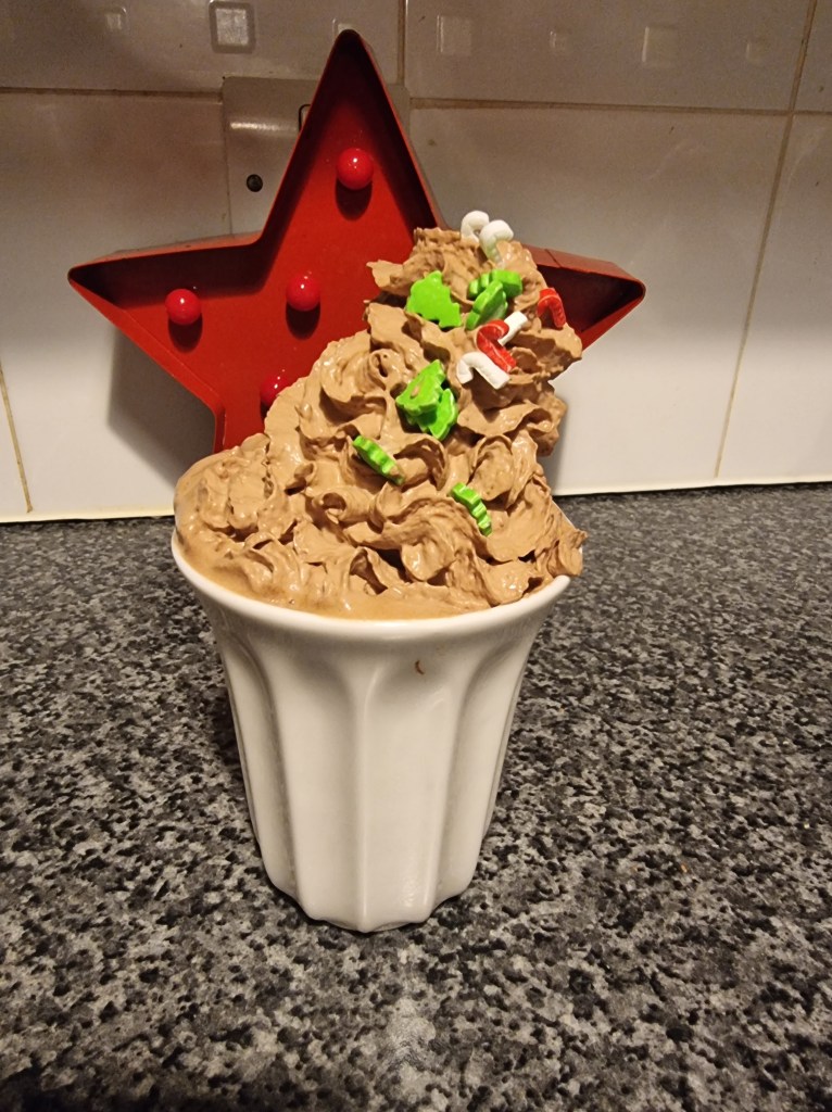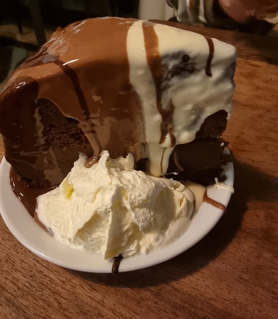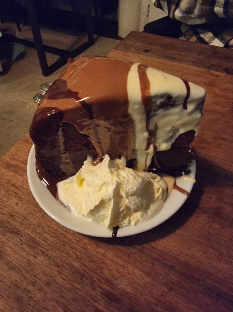 We added ‘triple chocolate’ to both our hot chocolate and the cake, which is the drizzle you can see cascading down the side of the mug and the cake.