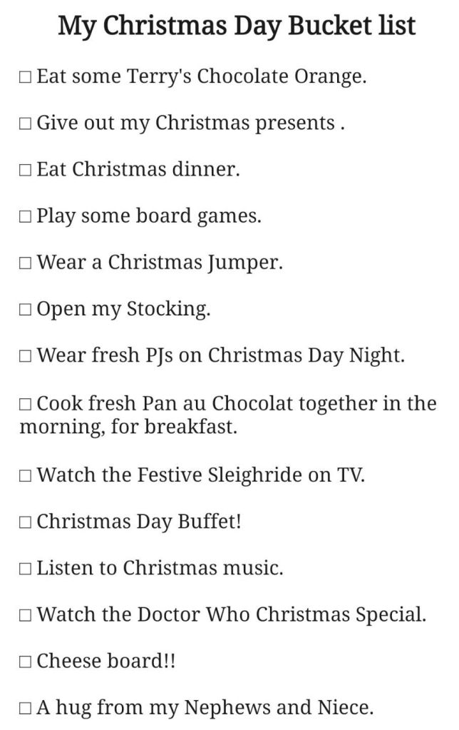 Again, traditions are a big part of Blogmas and its content. This is my list of ‘Wishes’ for Christmas day, most being pretty much what we do each year.