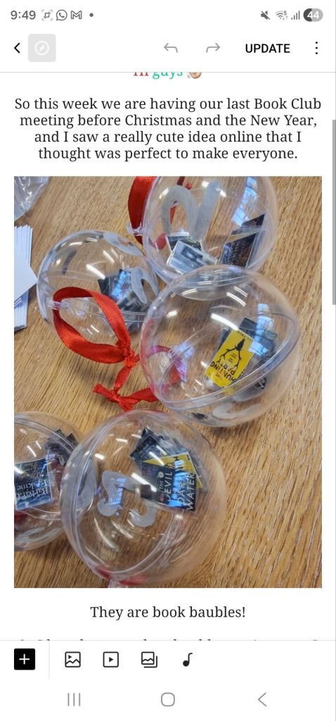 I made a cool book themed present for everyone, a book baubles filled with the books we’d read together that yeat.